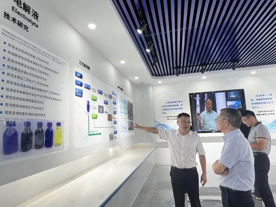 在张忠裕等的陪同下,调研组一行首先参观了星明能源钒电池电解液生产制造车间和钒电池展览馆,听取了川威集团钒电解液、电堆等方面的研究和成绩介绍。