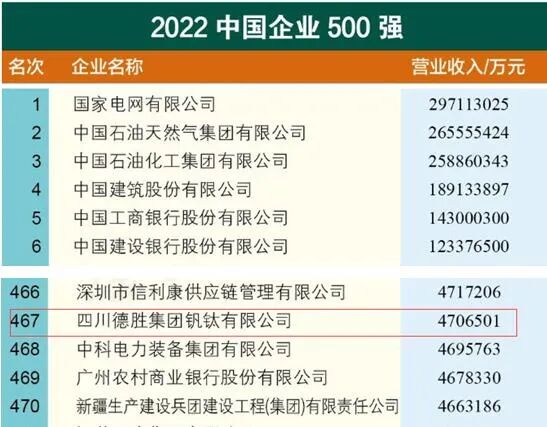 9月6日,中国企业联合会、中国企业家协会发布“2022中国企业500强”榜单,德胜集团继续入围,位列“2022中国企业500强”第467位, “2022中国制造业企业500强”第232位,也是乐山唯一一家上榜“2022中国企业500强”的企业。