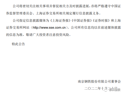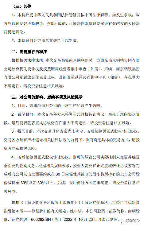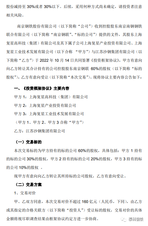 南钢股份10月20日发布公告,复星国际子公司上海复星高科技(集团)有限公司及其下属子公司上海复星产业投资有限公司、上海复星工业技术发展有限公司与江苏沙钢集团有限公司于2022年10月14日共同签署《投资框架协议》,交易各方有意向转让/受让南钢股份控股股东南京南钢钢铁联合有限公司60%的股权,交易对价不超过160亿元。