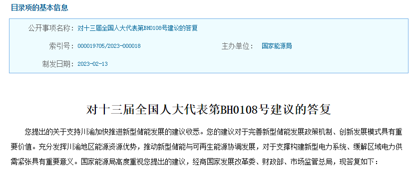 国家能源局对支持川渝加快推进新型储能发展建议的回复