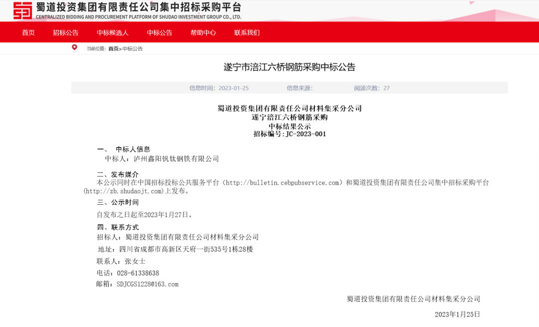 近期,遂宁市涪江六桥在网上公开招标建筑钢材直供商,鑫阳钢铁凭“泸钢牌”高强度建筑钢材的质量优势和高效的生产服务能力,成功在蜀道集团招标平台中标遂宁市涪江六桥的建筑钢材直供商并签约合作。