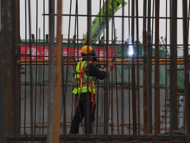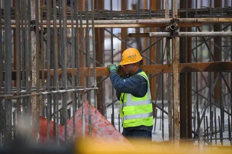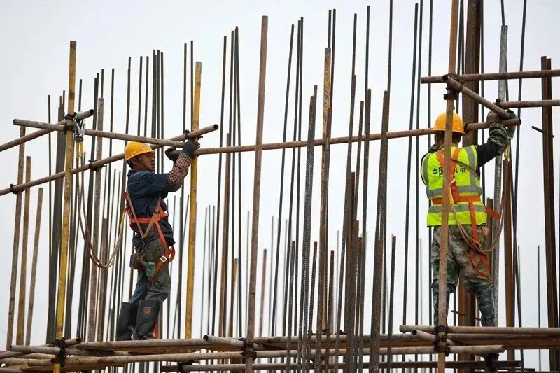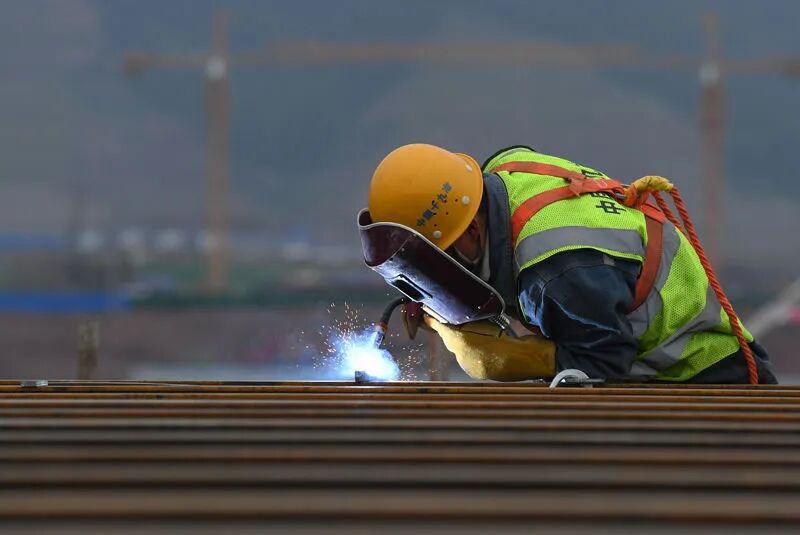 ↑5月25日,施工人员在四川省达州市方大集团达钢搬迁升级项目现场作业。