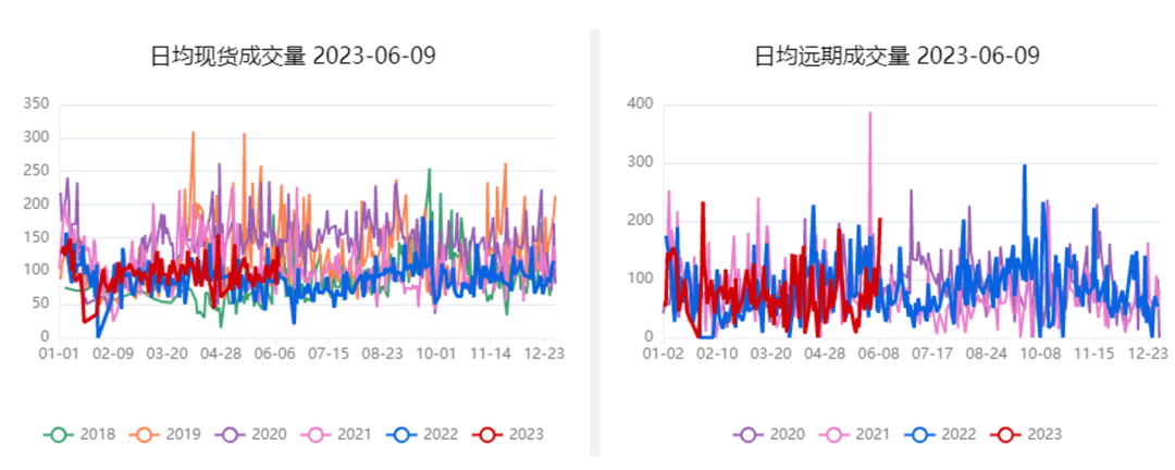 截至2023年6月10日,现货成交日均96.2万吨,去年91.8万吨,同比增加44.4;远期日均成交80.5万吨,去年84.1万吨,同比减少3.6万吨;