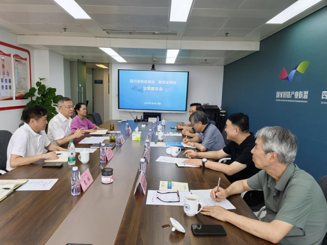 7月4日,陕西省钢铁工业协会一行赴国家钒钛产业联盟、四川省钒钛钢铁产业协会,就产业协同发展、技术创新合作等议题进行了深入交流探讨。此次交流活动,旨在加强区域间产业联动、协同,为钢铁及钒钛产业高质量发展注入新动力。陕西省钢铁工业协会由副会长兼秘书长、党支部书记王隽锋带队,陈晓、刘光明、郭清海等副秘书长参与;国家钒钛产业联盟秘书长、四川省钒钛钢铁产业协会党支部书记张邦绪,四川省钒钛钢铁产业协会秘书长罗清明,副秘书长汪洋、工会主席文琳等参加调研。